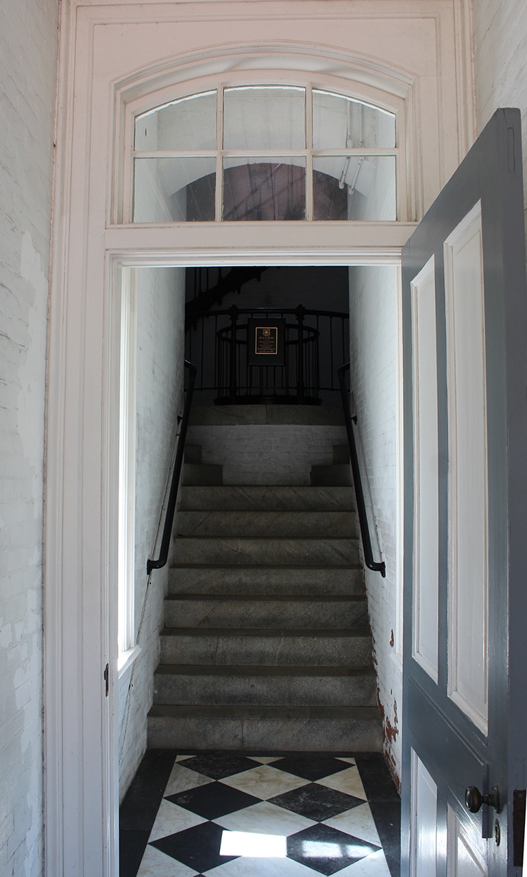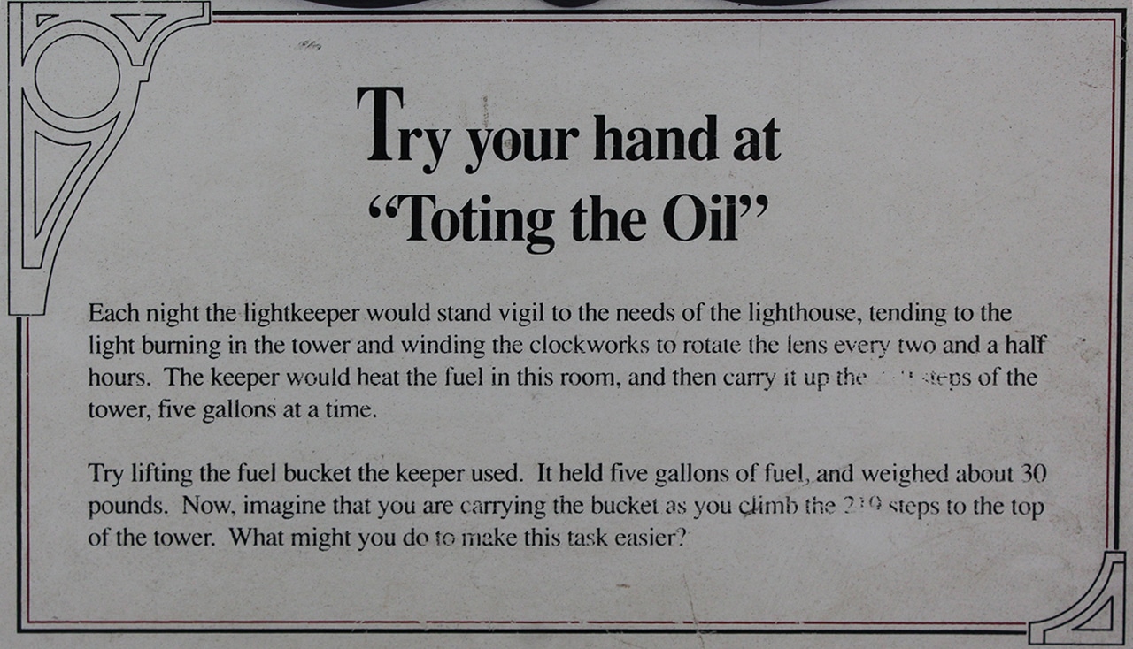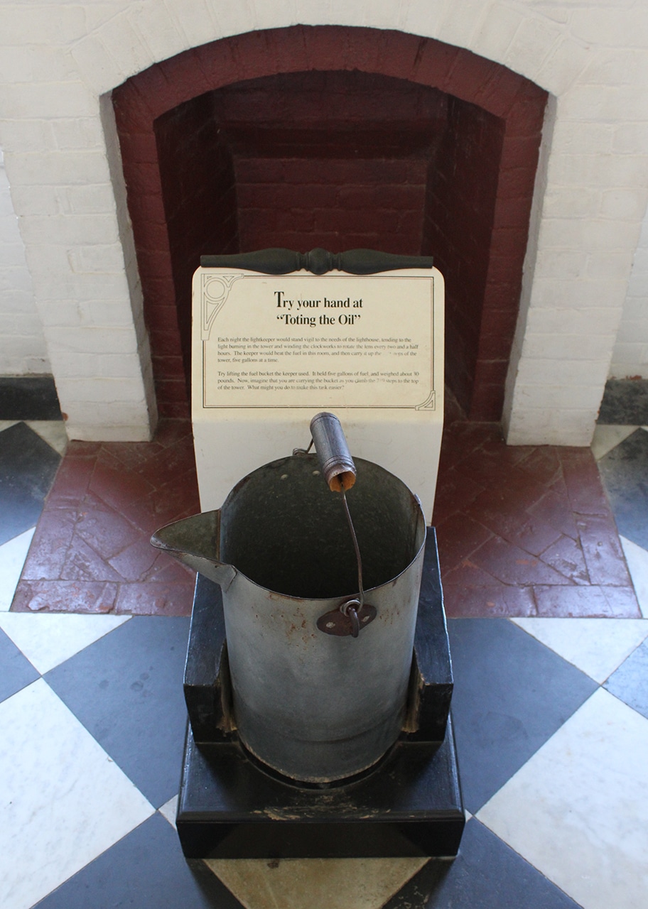 Next up was the oil room, the keeper’s office and the tower. In the oil room were several storage tanks and the display below where you can “Try your hand at Toting the Oil”. Can you imagine carrying this five-gallon bucket weighing about thirty pounds, filled with HOT oil up 219 stairs several times a day? I get tired just thinking about getting myself up 219 stairs! He also had to wind the clockworks, to rotate the lens every two and a half hours. They had a tough job saving ships from demise on their coastlines, and their families had to step in where needed.