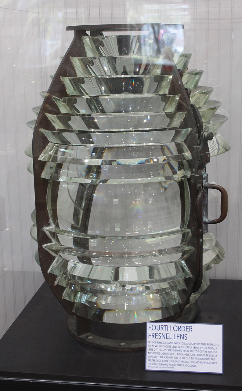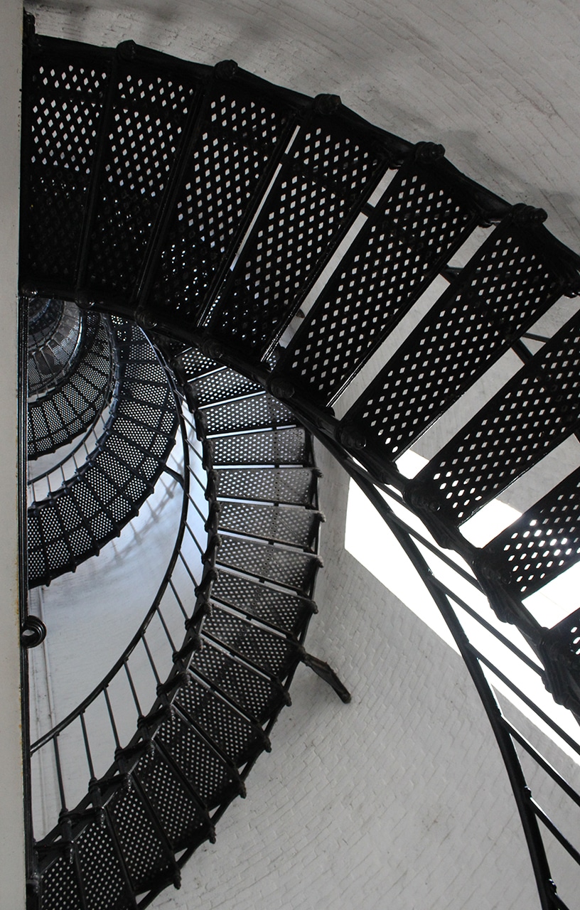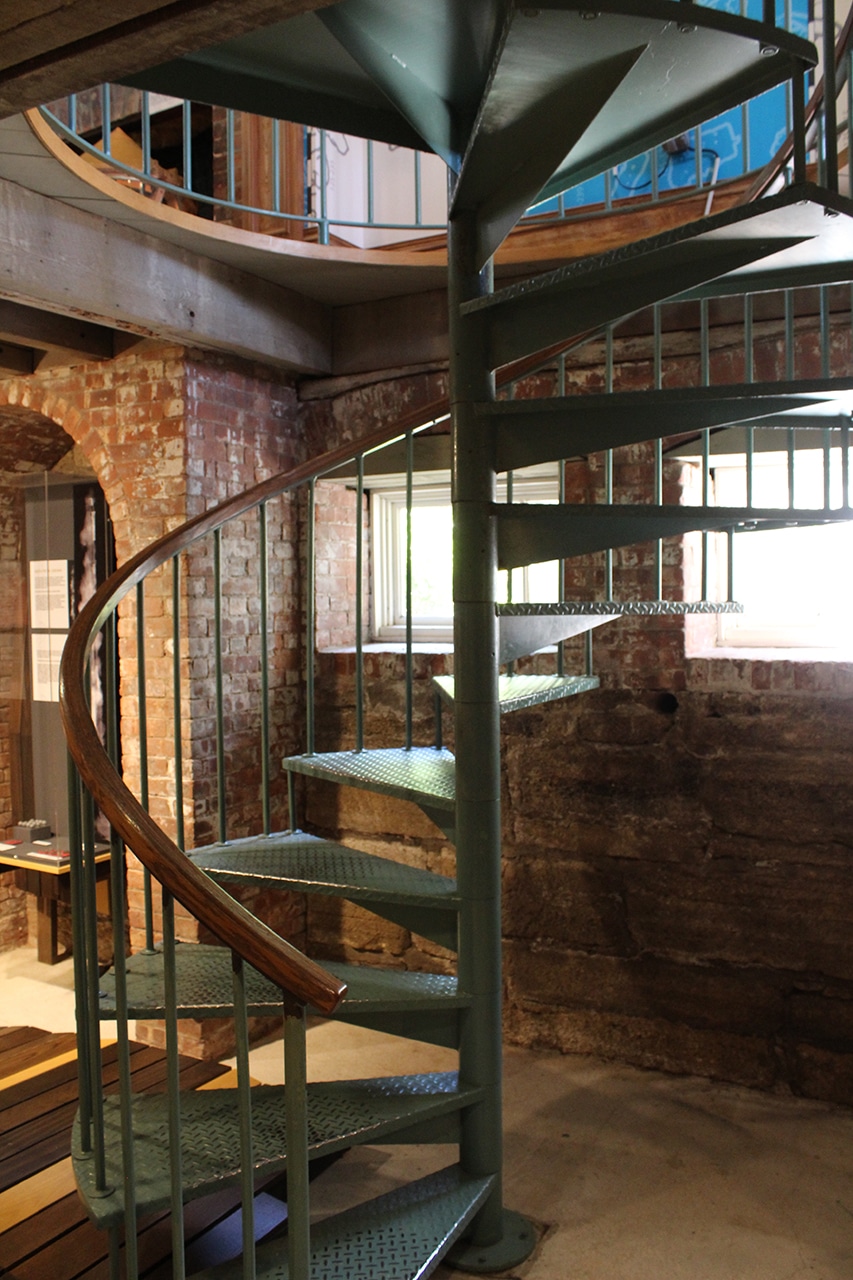 Next up was the oil room, the keeper’s office and the tower. In the oil room were several storage tanks and the display below where you can “Try your hand at Toting the Oil”. Can you imagine carrying this five-gallon bucket weighing about thirty pounds, filled with HOT oil up 219 stairs several times a day? I get tired just thinking about getting myself up 219 stairs! He also had to wind the clockworks, to rotate the lens every two and a half hours. They had a tough job saving ships from demise on their coastlines, and their families had to step in where needed.