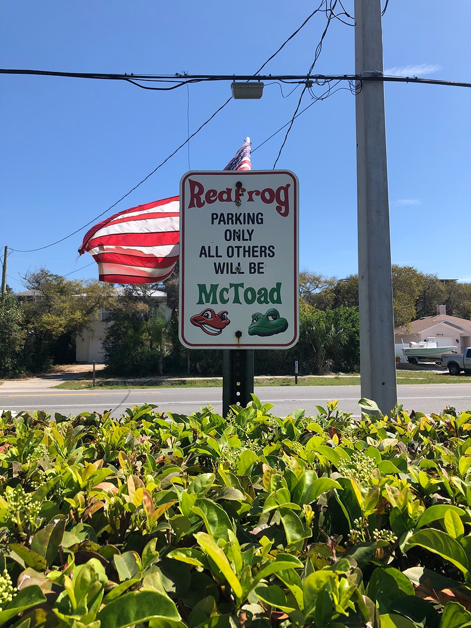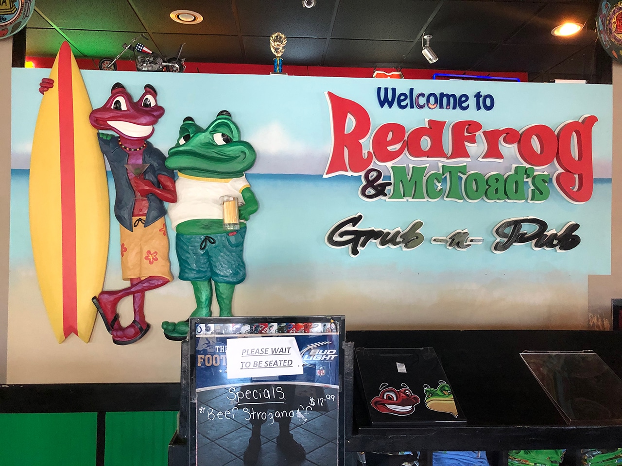 We saw a billboard for Redfrog & McToad’s Grub & Pub that looked intriguing. We were pretty hungry and hadn’t stopped till now because all along the way, restaurant parking lots were full of motorcycles making their way home after a busy week. Our waitress said they were only serving breakfast for another ten minutes, so we quickly made our choice and settled in.