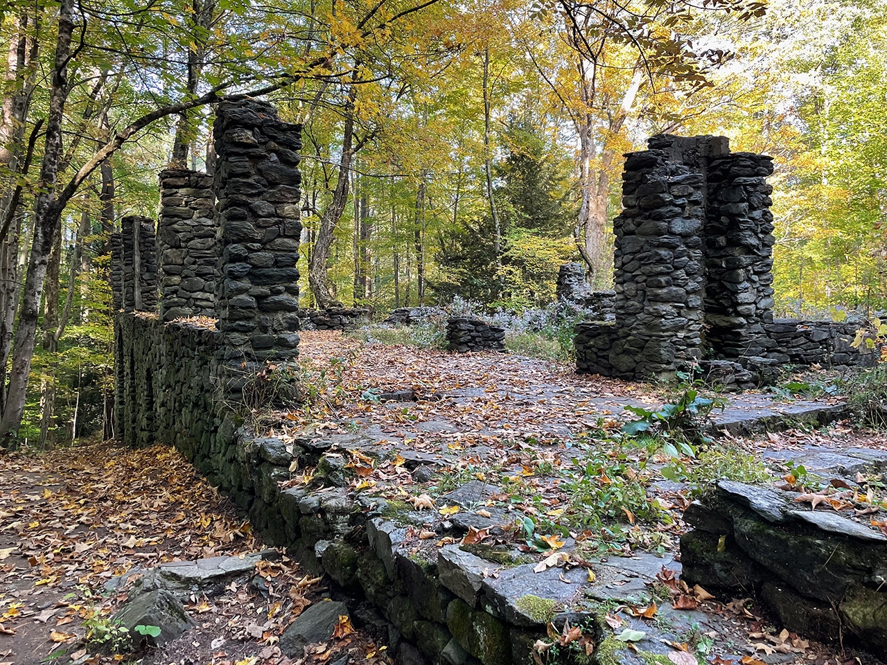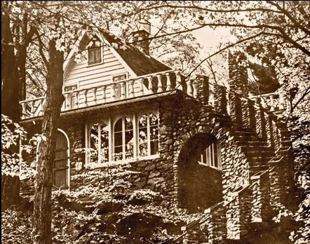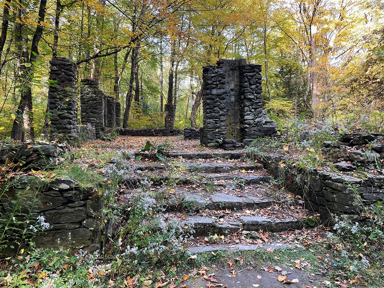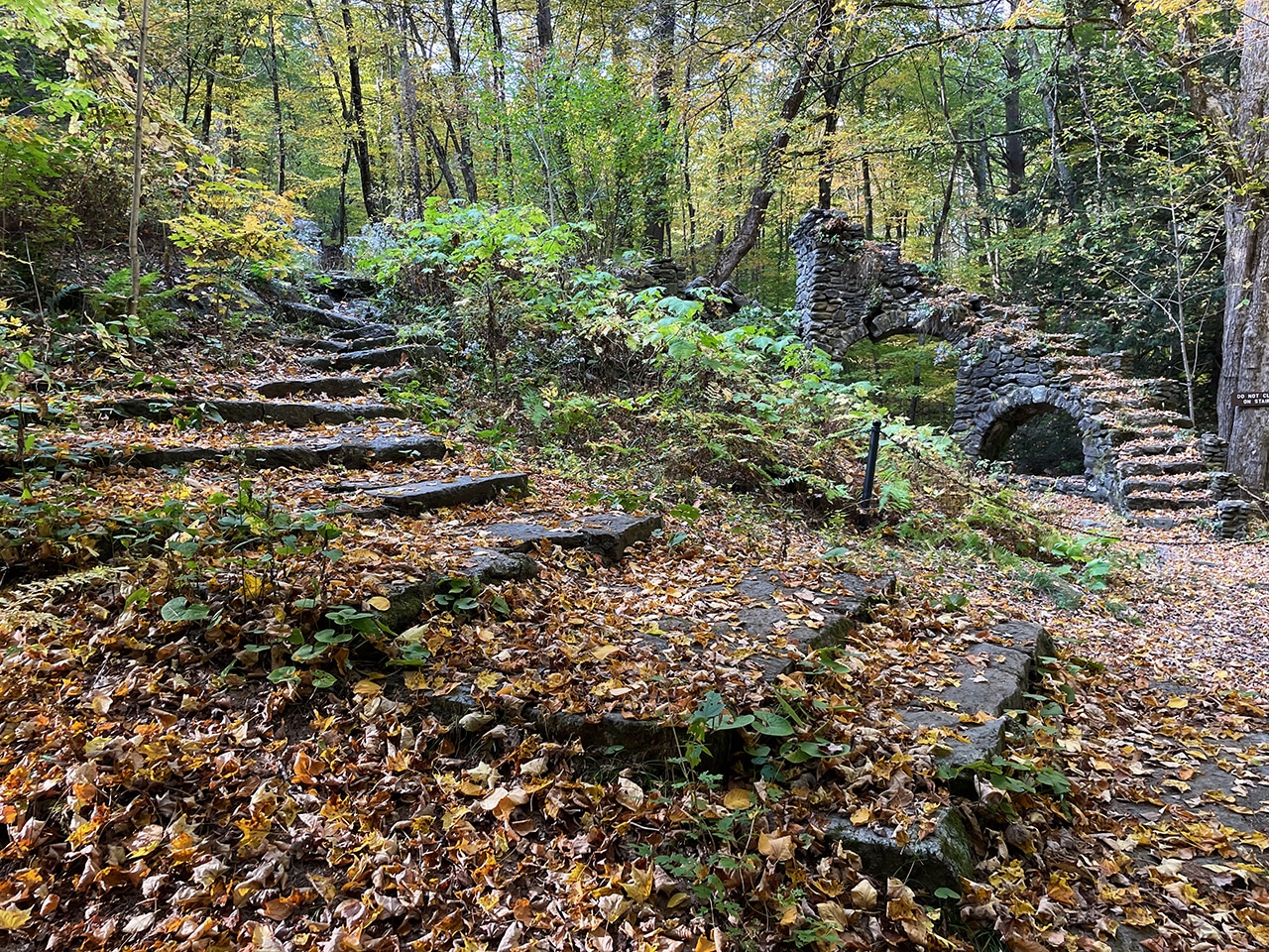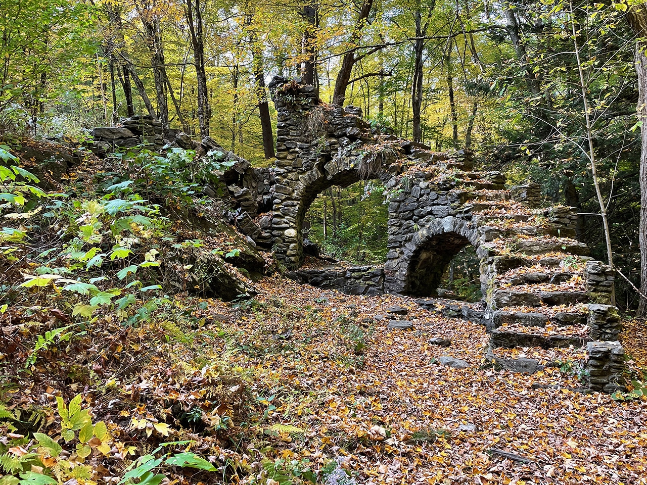 “The Madame Sherri Forest is named after a former owner, Madame Antoinette Sherri, a Paris-born theatrical costume designer who worked in New York City during the early 1900s. She and her husband built a French-inspired chateau summer house in Chesterfield that featured extensive stonework including a roman arch stairway, ornate interior, and designed landscape gardens. There they lavishly entertained their New York City friends at parties during the Roaring 1920s.