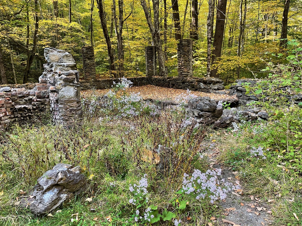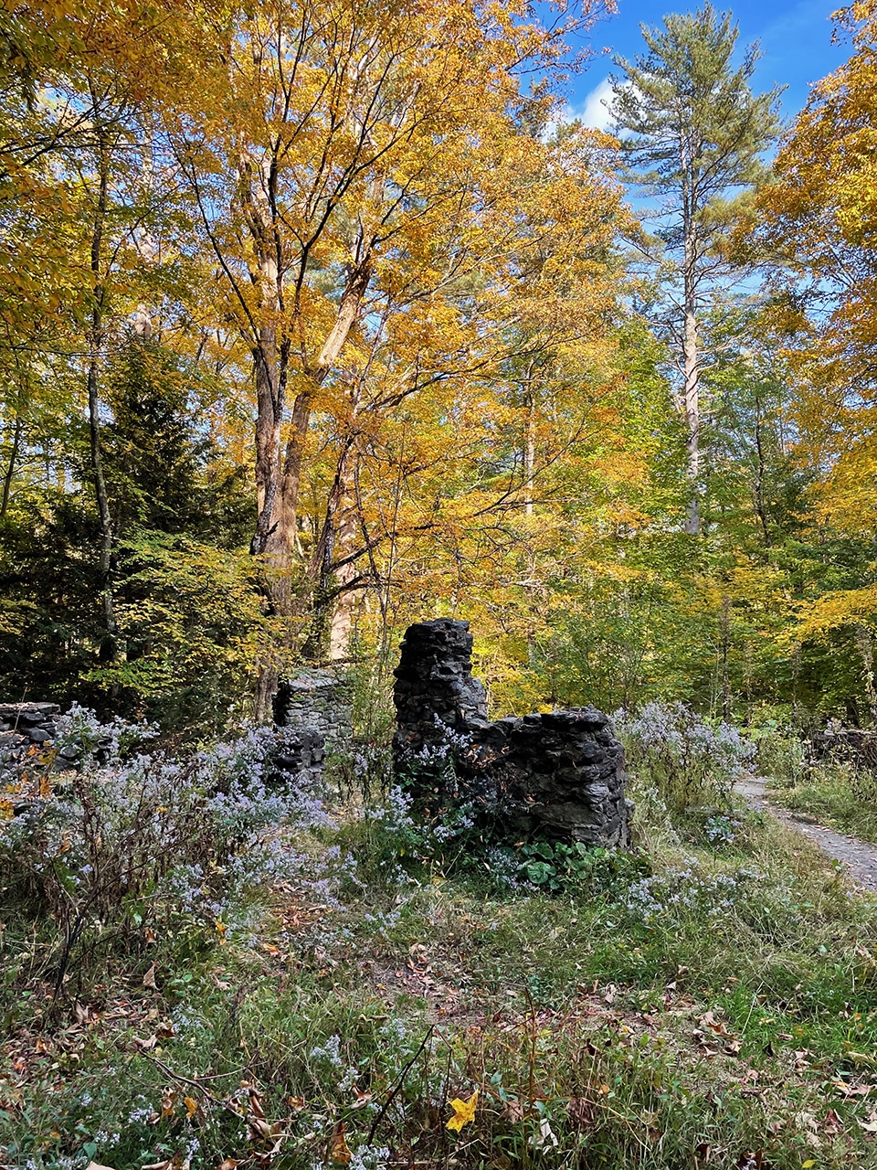 She left, heartbroken, never to return again. The house burned down completely in 1963. Today, ancient sugar maples surround a stone foundation and stairway, a large empty fireplace tapers to a freestanding chimney. This is all that remains of the former summer home of Madame Sherri who died in Brattleboro on October 21, 1965.” ~ READ MORE