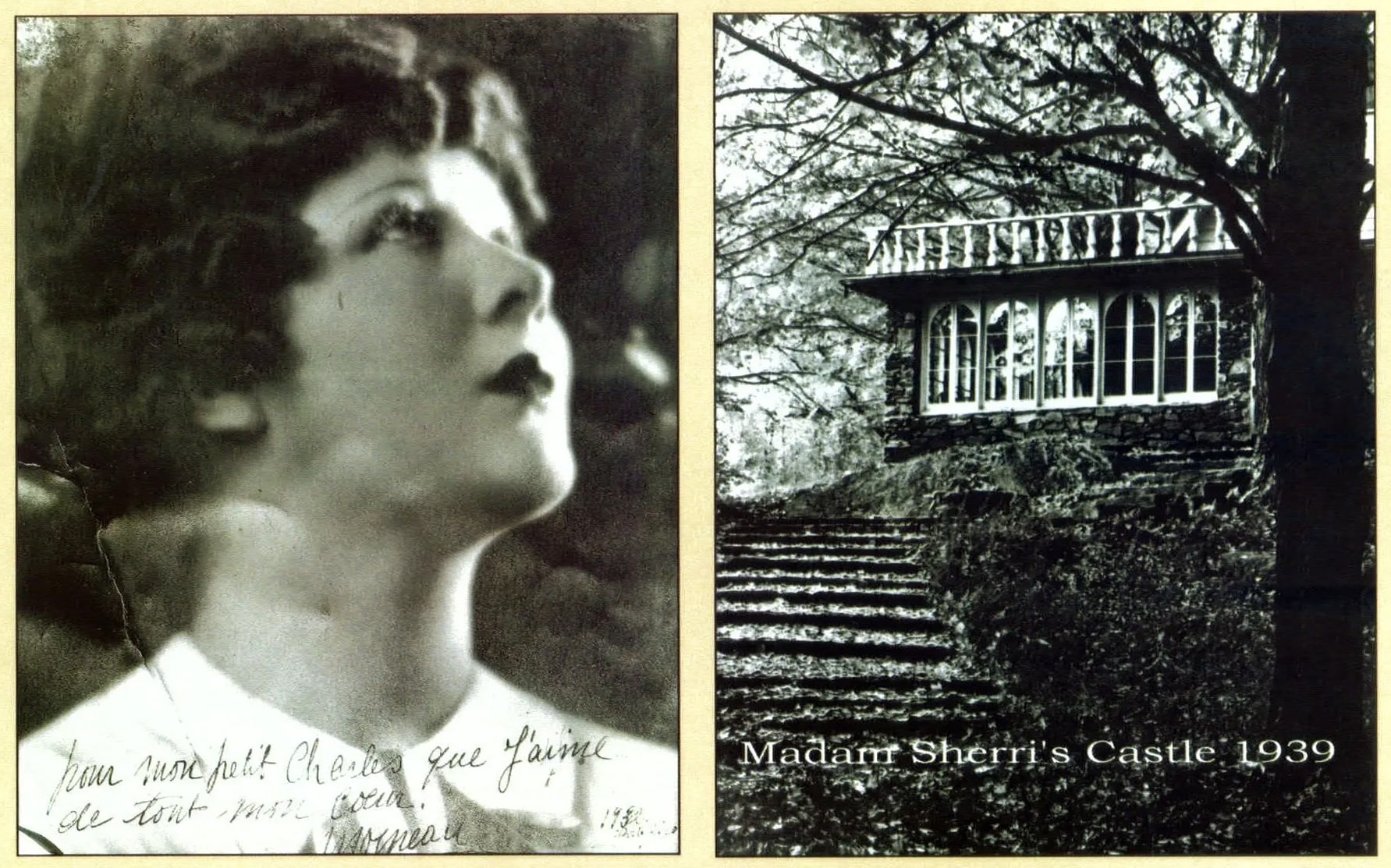 “Madame Sherri became famous – or infamous – for her wild parties. Her chauffeur-driven Packard, her fur coat, and her fast crowd of friends made the townsfolk talk whenever she appeared. However, in time Madame Sherri’s fortunes declined, and her castle fell to ruin and vandalism. After a long separation, she returned to the house in 1959 to find the interior badly vandalized.