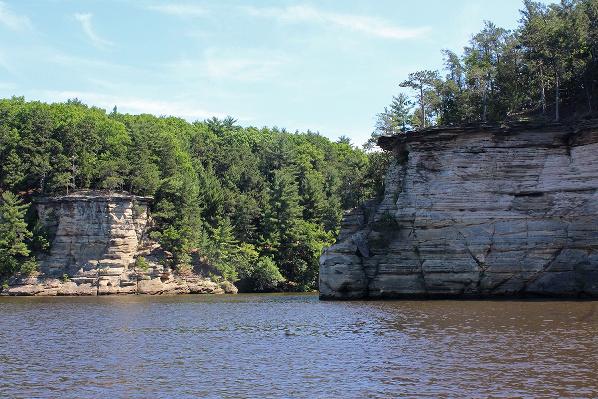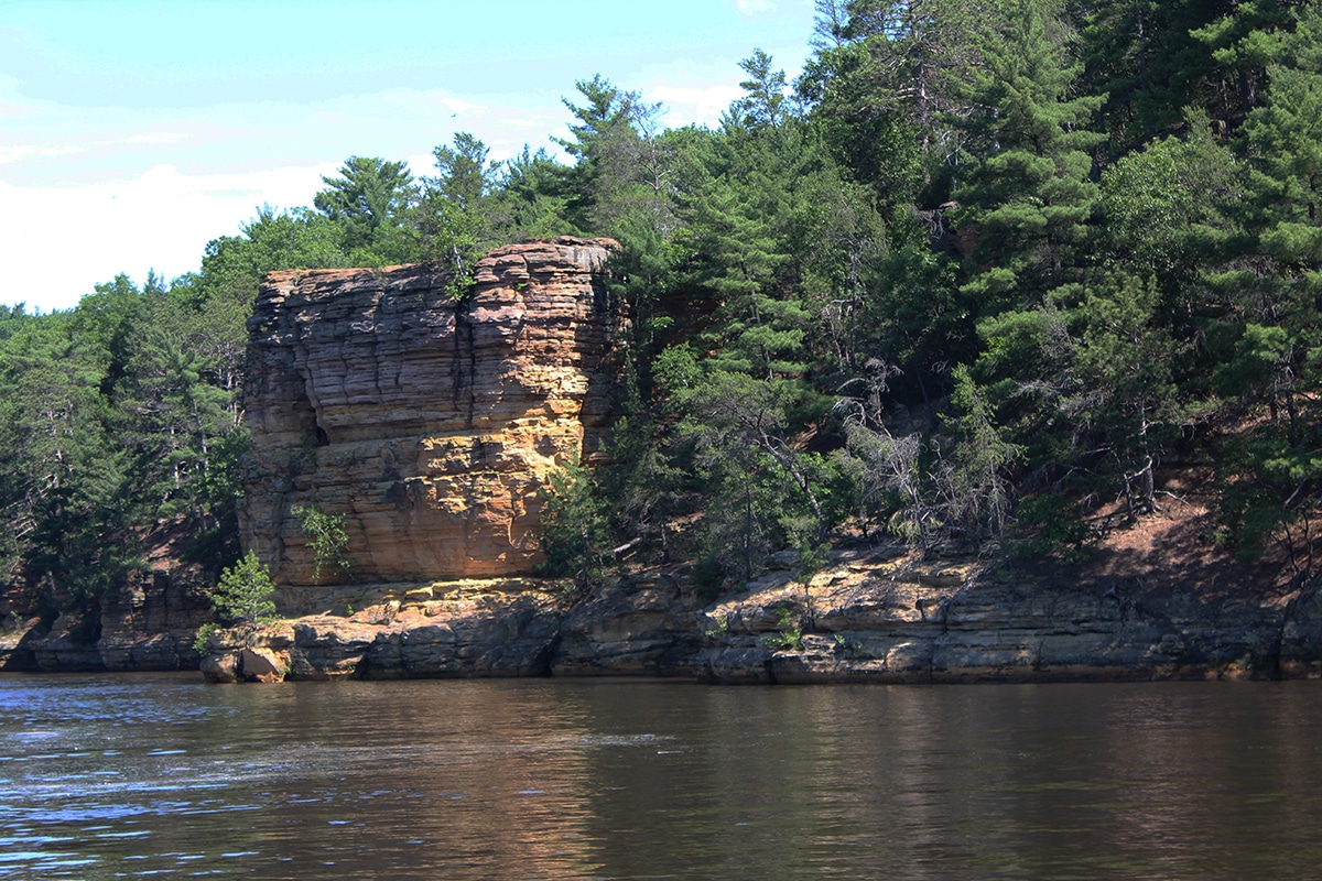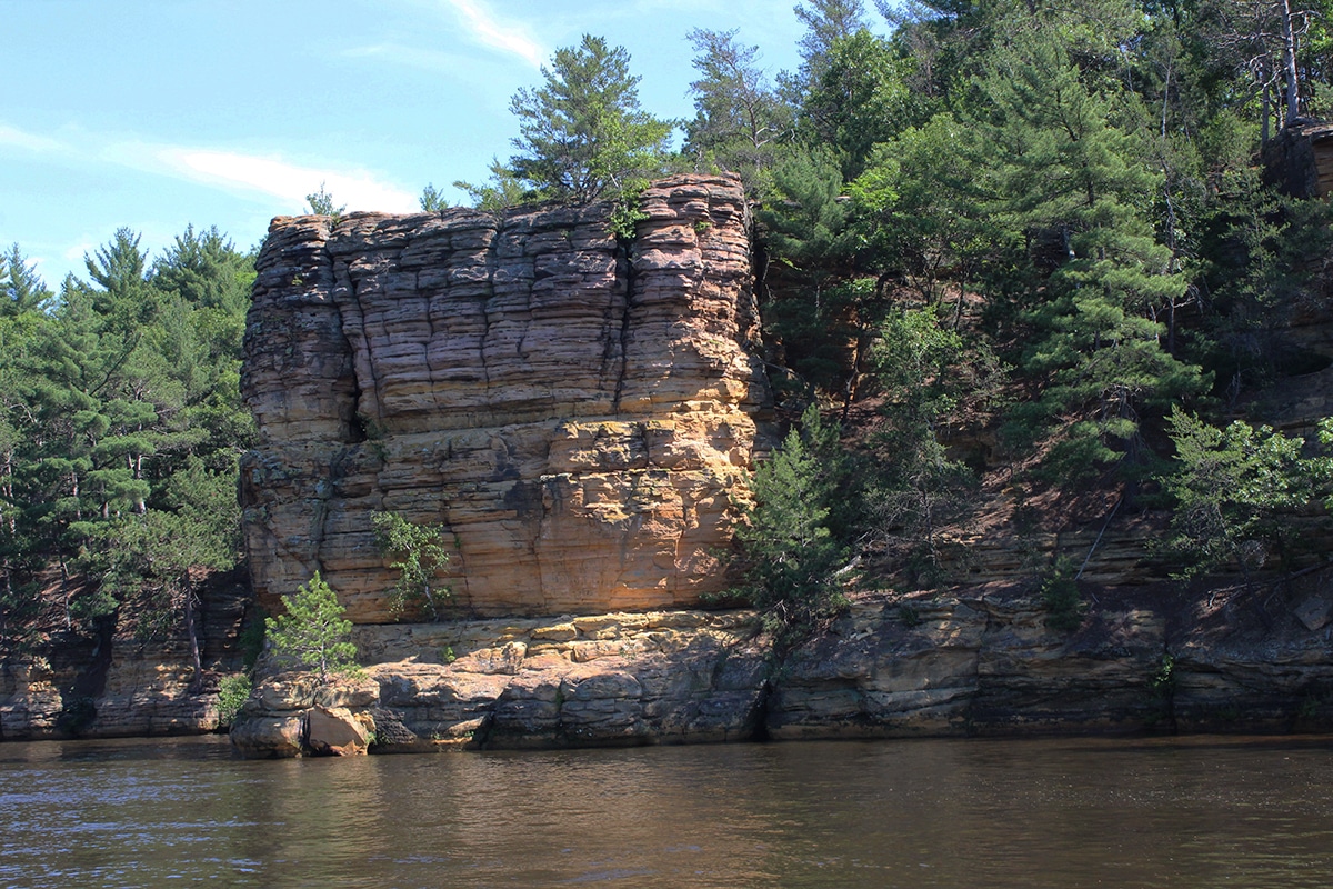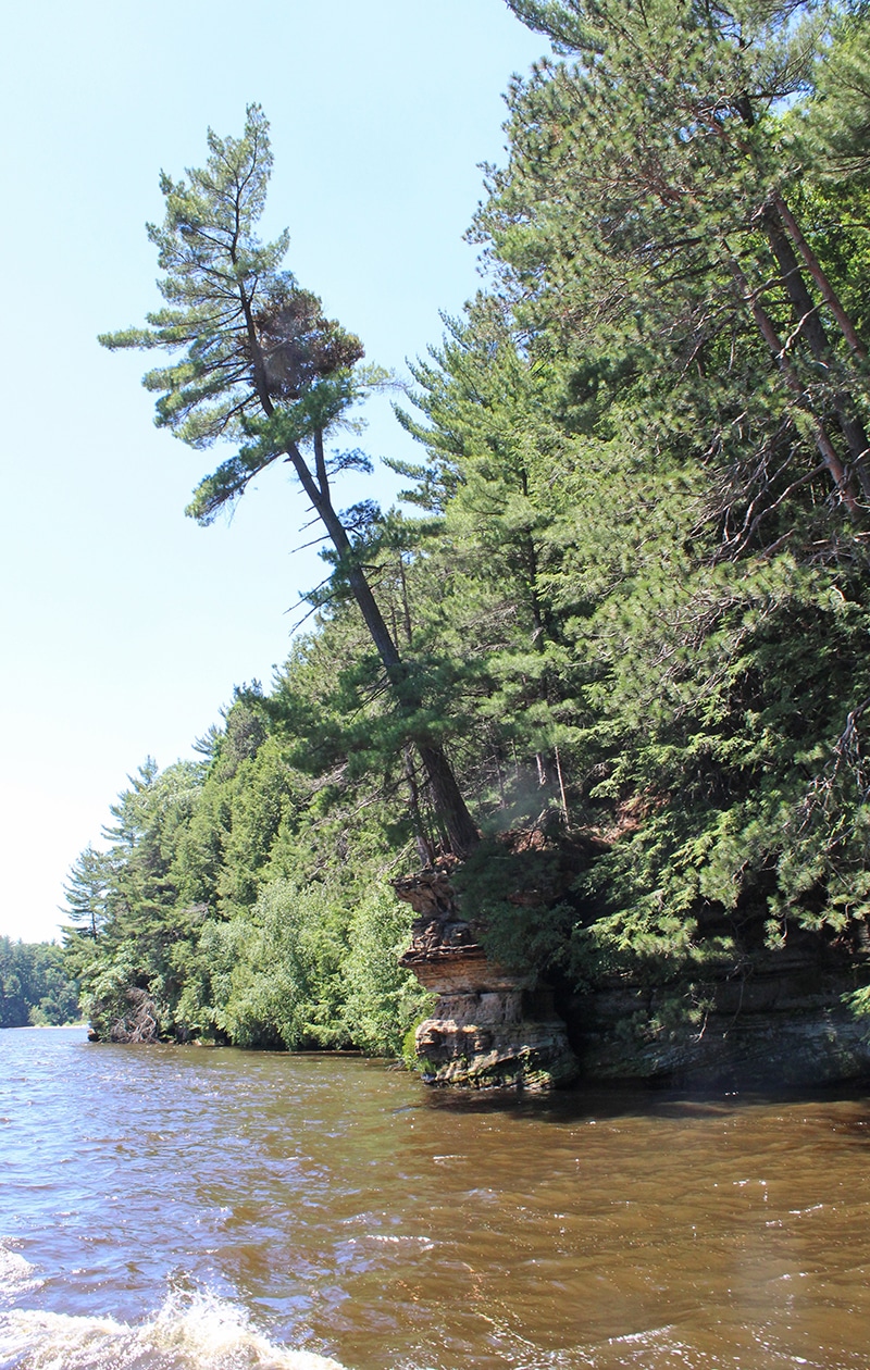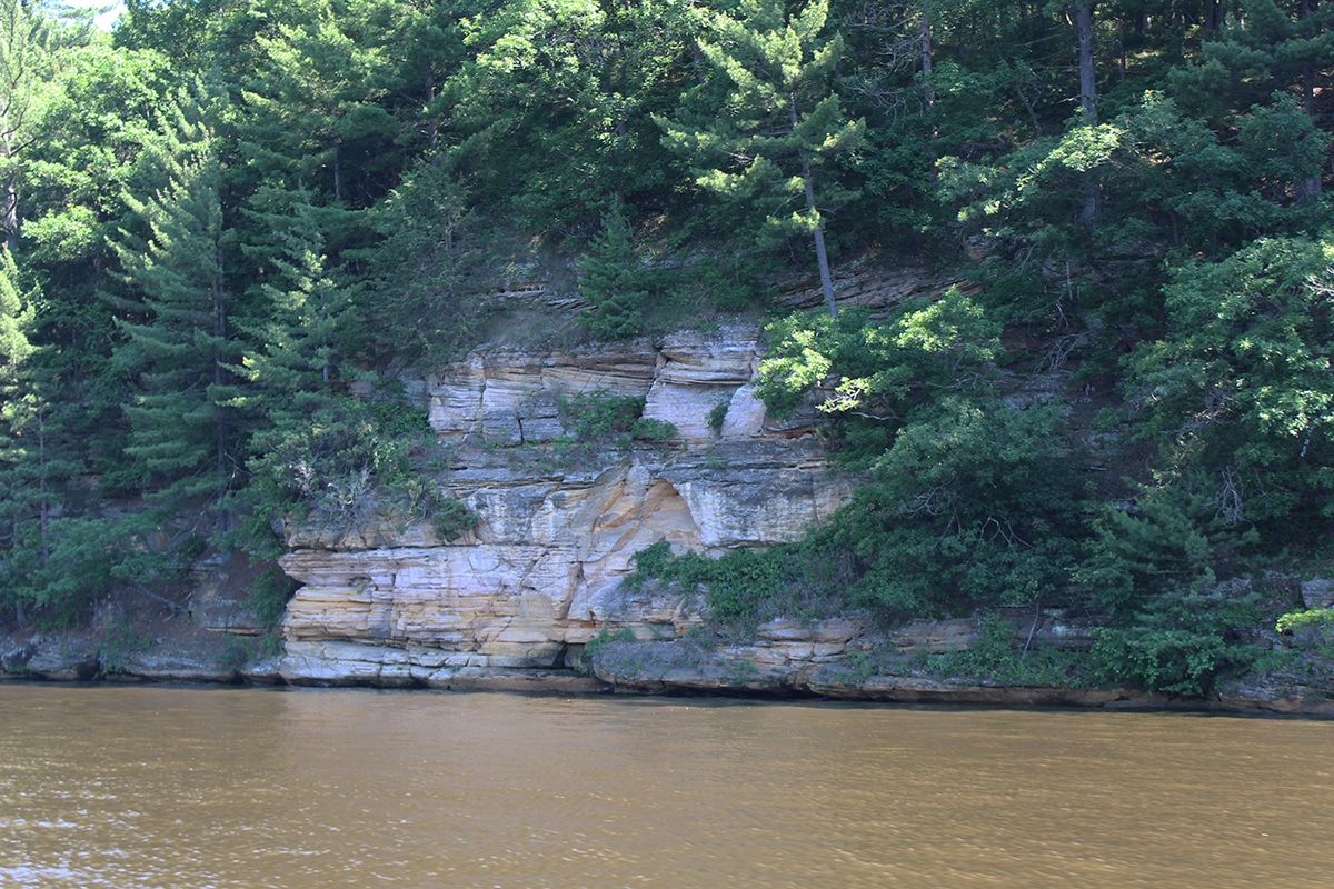 Our journey began just north of the dam that separates the Upper and Lower Dells – shown in the top photos. We enjoyed towering sandstone cliffs on the most scenic section of the Wisconsin River during this two-hour ride aboard the Yellow Thunder. We sat on the back end to make it easier for pictures, although my husband would have preferred to be on the top deck – which was full by the time we boarded. Either way, if you’re outside bring your sunscreen because it gets a little scorching out there. There was an intercom system that would have worked better had we been in the interior seating section, but we strained to hear what the tour guide was saying and we purchased the brochure that they passed around at the end of the tour so we could read about what we kind-of heard. This brochure will be very helpful as I recall the highlights of our trip.