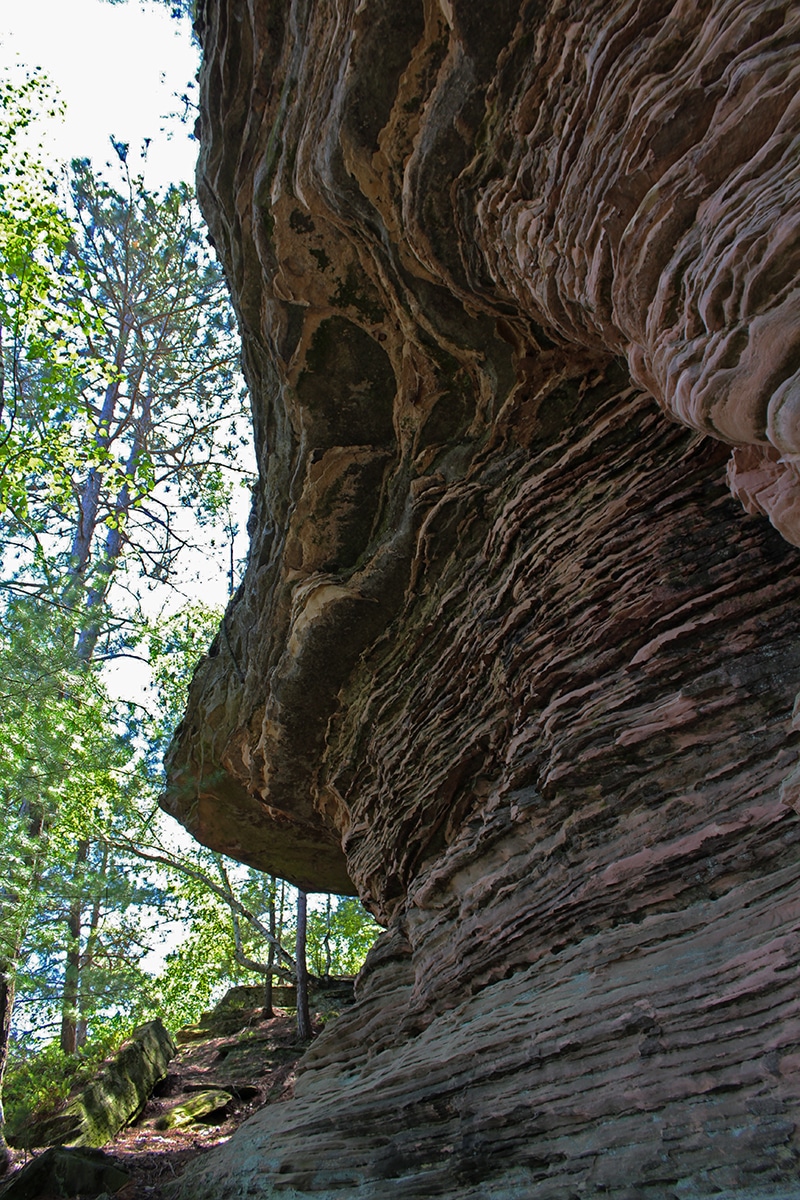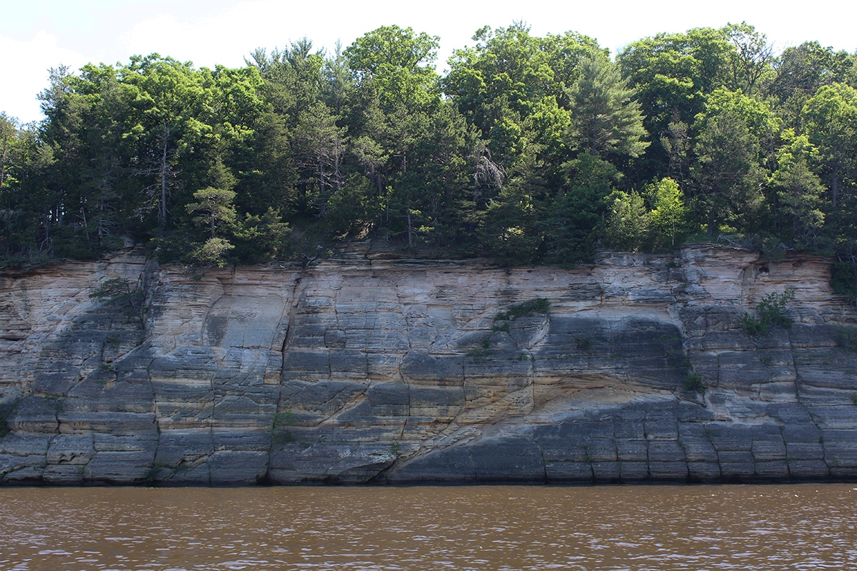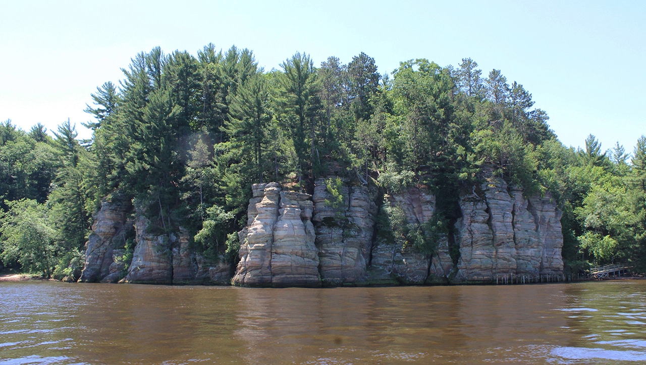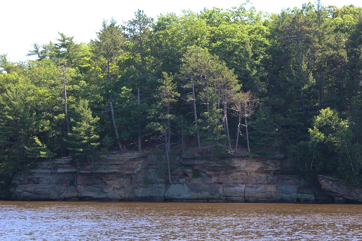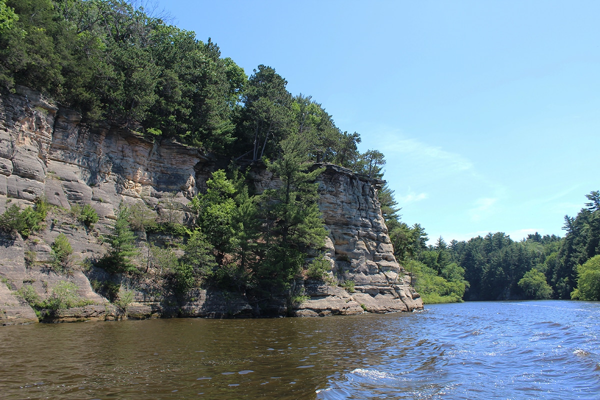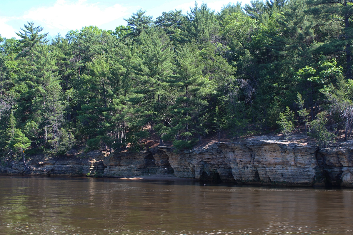 Our journey began just north of the dam that separates the Upper and Lower Dells – shown in the top photos. We enjoyed towering sandstone cliffs on the most scenic section of the Wisconsin River during this two-hour ride aboard the Yellow Thunder. We sat on the back end to make it easier for pictures, although my husband would have preferred to be on the top deck – which was full by the time we boarded. Either way, if you’re outside bring your sunscreen because it gets a little scorching out there. There was an intercom system that would have worked better had we been in the interior seating section, but we strained to hear what the tour guide was saying and we purchased the brochure that they passed around at the end of the tour so we could read about what we kind-of heard. This brochure will be very helpful as I recall the highlights of our trip.