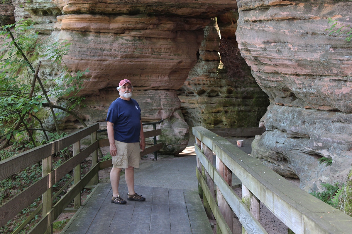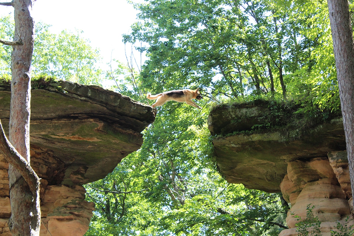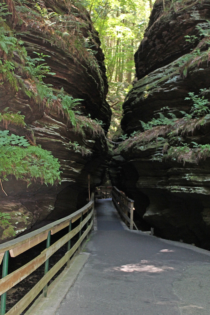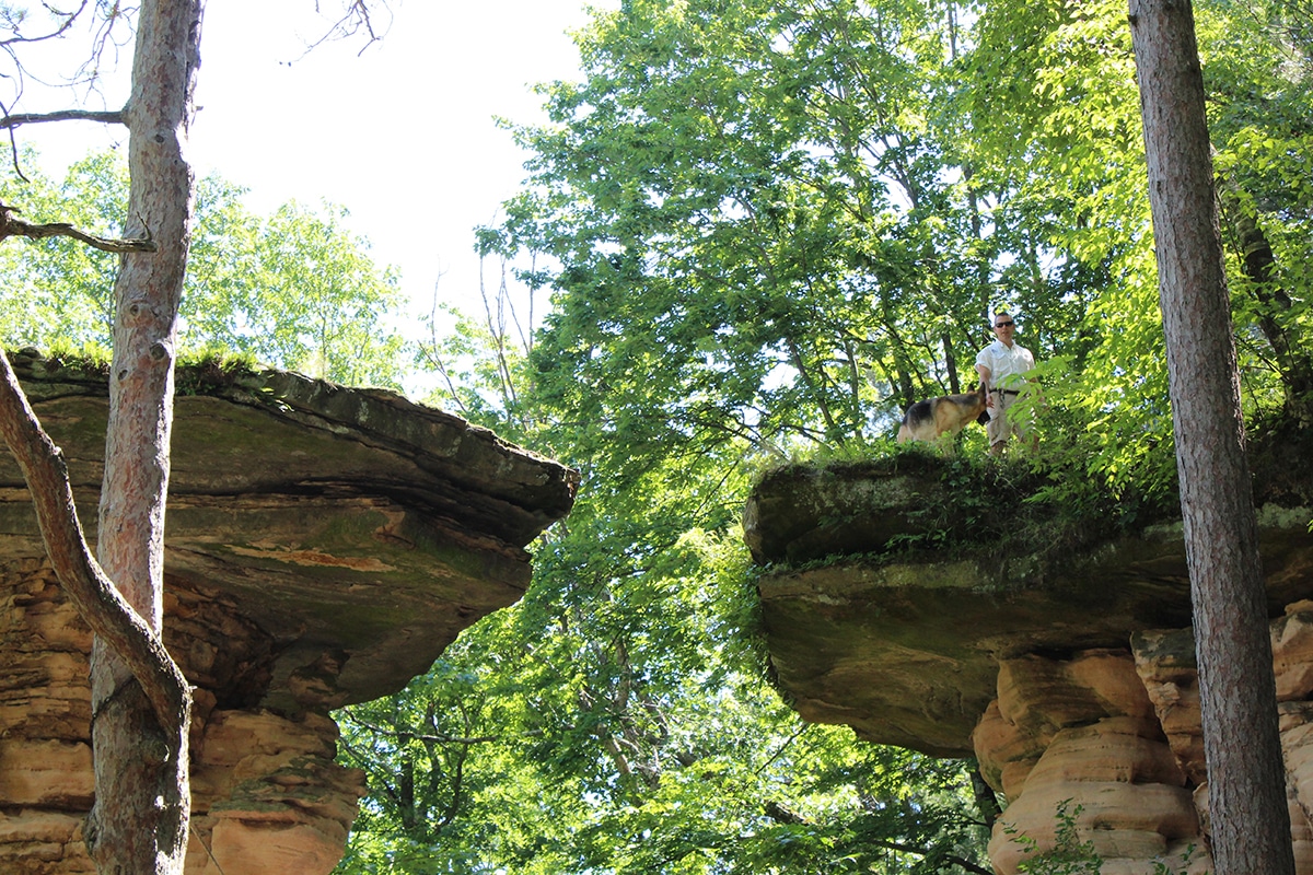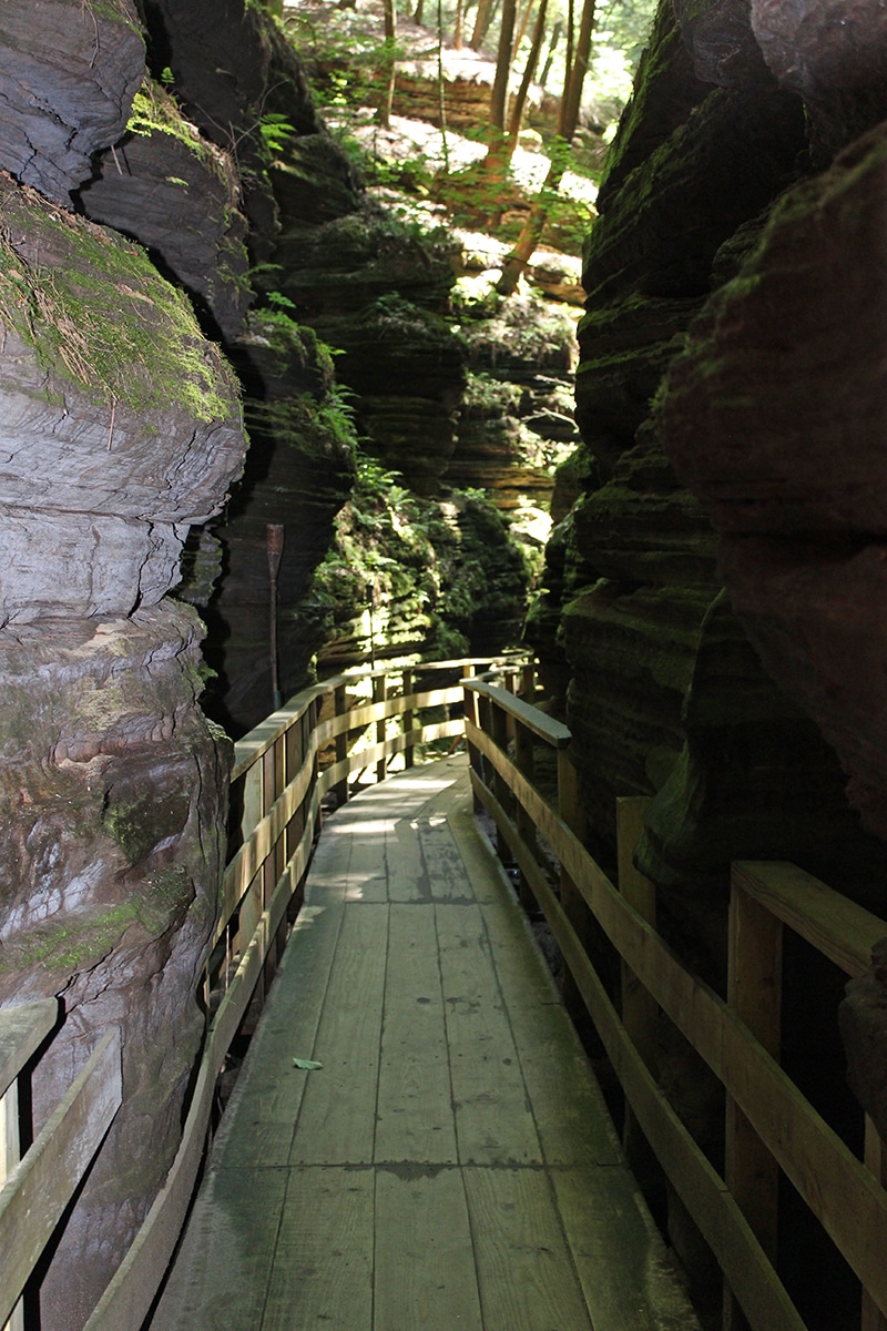 Next stop is Stand Rock. HH Bennett, a photographer famous for his pictures of the Wisconsin Dells area between 1865 and 1908, captured his son making this 5-ft leap in 1886 to prove that his new invention of an advanced shutter technology worked. After that photograph went viral, he would snap pics of brave tourists making the jump! That practice continued until insurance companies put a stop to that in the 1940s and specially trained dogs took over the task. There is a net below, but not sure that was there years ago.