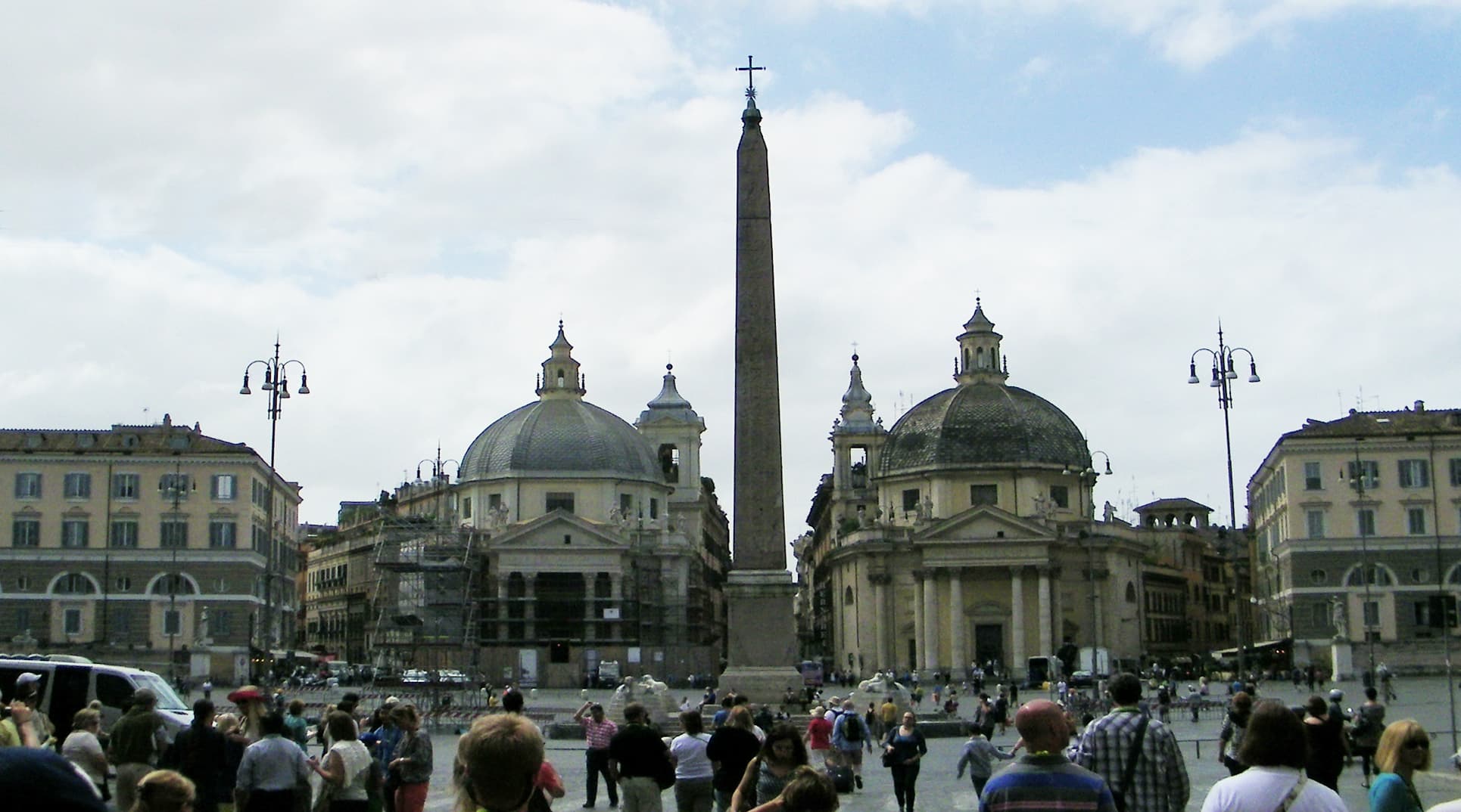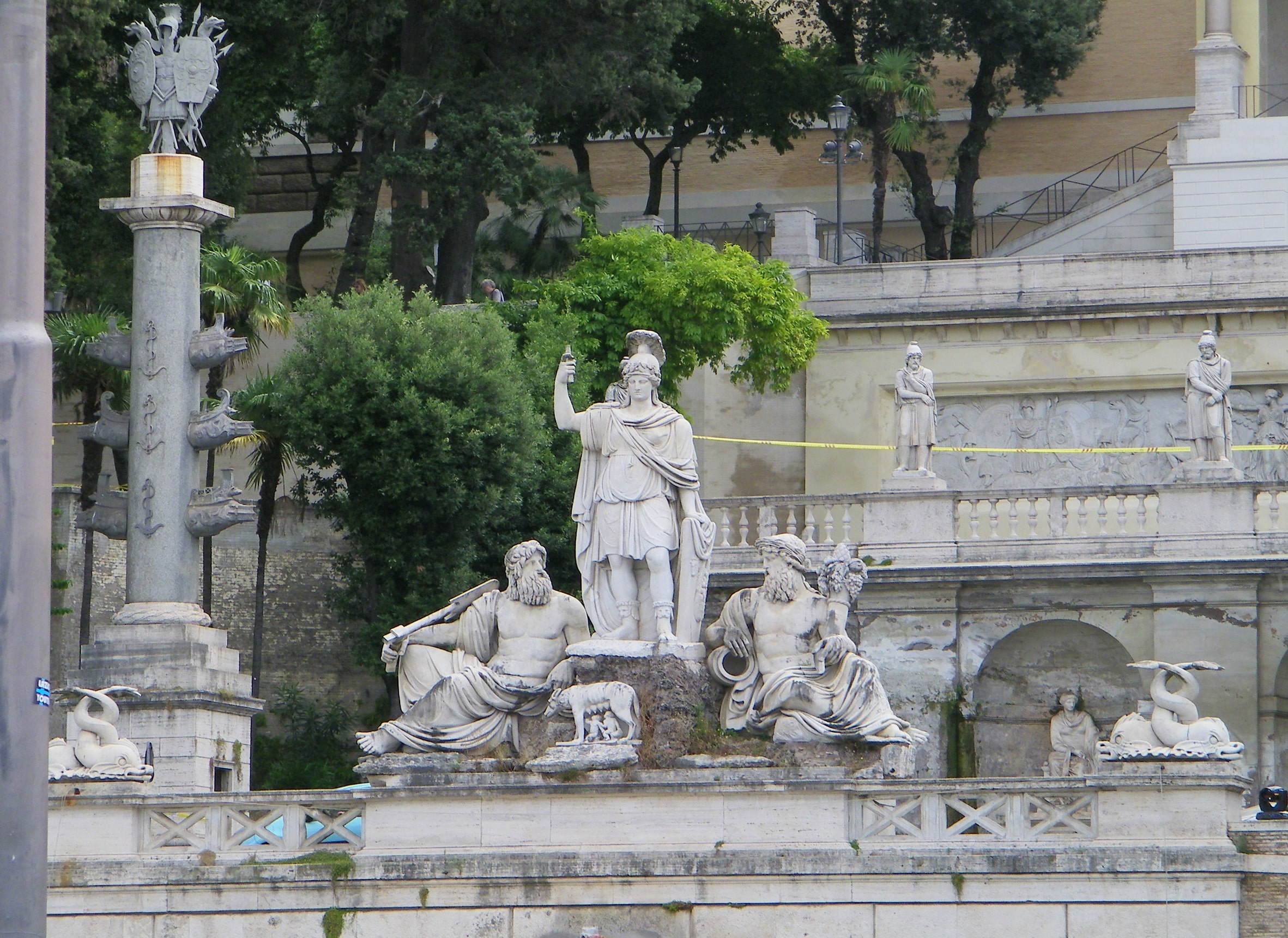 The photo above was taken as we entered the Piazza del Popolo (Square of the People) from the north. It shows the twin churches of Santa Maria di Montesanto (left) and Santa Maria dei Miracoli (right), which were commissioned by pope Alexander VII in 1658 and designed by Carlo Rainaldi. Although they were meant to be identical, the plot of ground provided for the Santa Maria in Montesanto (on the left) was smaller. In an effort to give the impression they were identical, Rainaldi created an oval dome for the smaller church and a circular dome for the Santa Maria dei Miracoli.