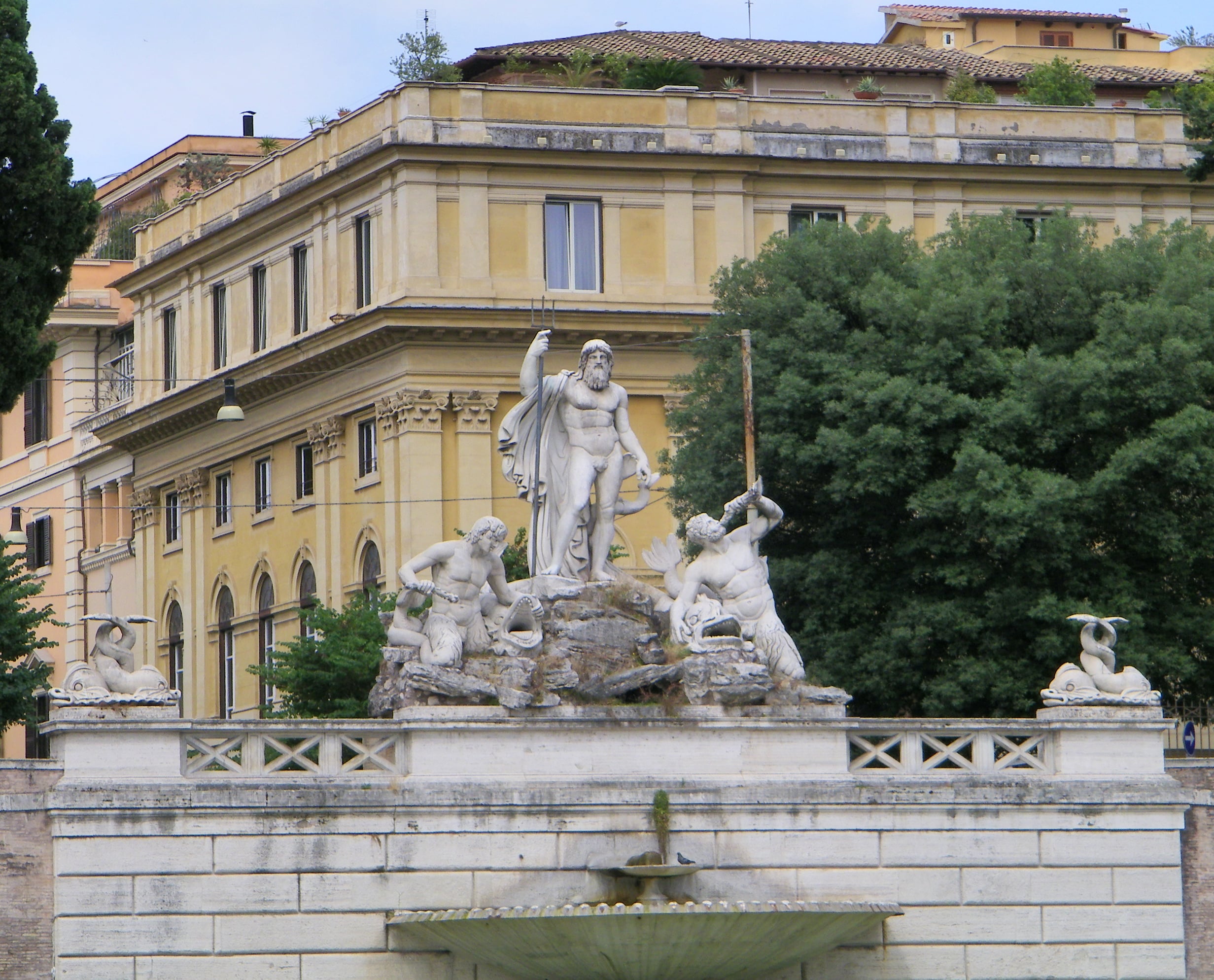 As the name implies, there were a lot of people milling around, but it was quite a wonderful sight. The square is adorned with three marble statues, which seems to be the norm in Rome – two of which are pictured. The fountain on the western end of the square is the Fontana del Nettuno (Neptune Fountain) and shows Neptune and his Tritons. The fountain opposite the Neptune Fountain, is known as the Fontana della dea di Roma (Fountain of the goddess of Rome). The tall figure is the goddess, and two symbolic figures representing the rivers Tiber and Aniene are on either side.