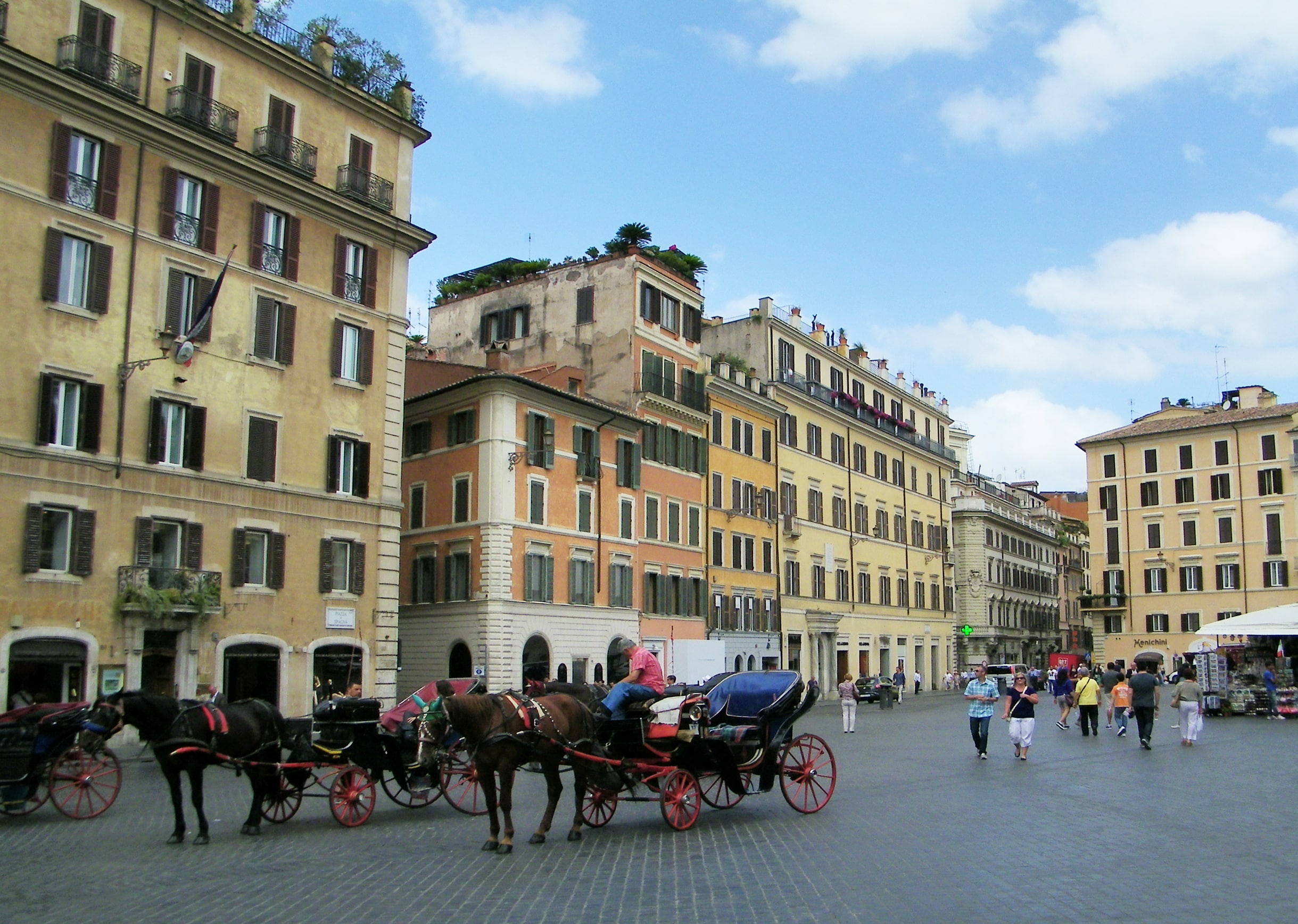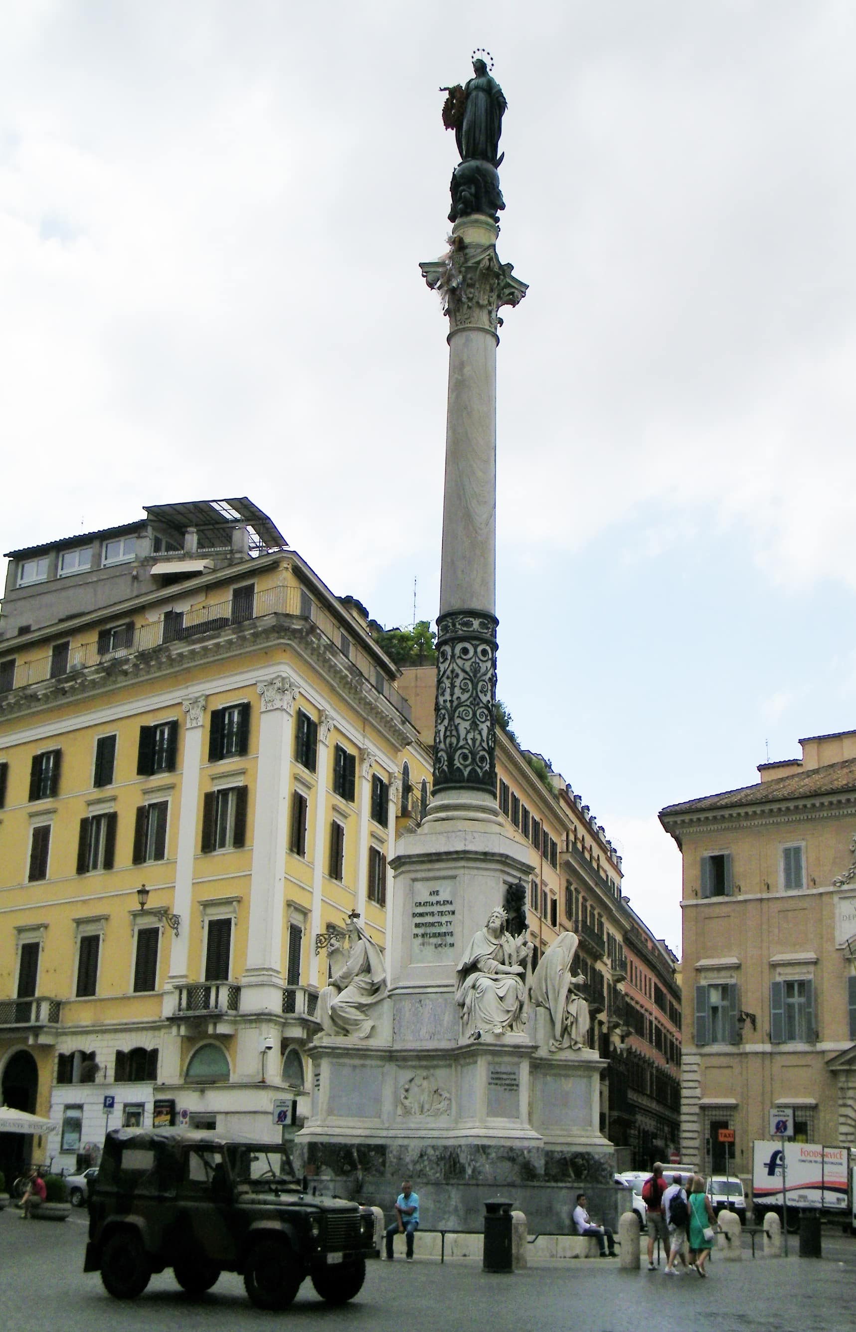In the center of the square is a tall, four-sided, monument which is topped by a cross and in the photo looks centered between the churches. This is called an Obelisk and Rome is the obelisk capital of the world. “In 1589, pope Sixtus V had the Egyptian obelisk of Sety I moved from Circus Maximus to the center of the square. The 23.2 meter (73ft) tall obelisk was originally built around 1300 BC and stood at the Sun Temple in Heliopolis. In 10 BC the Roman Emperor Augustus had the obelisk transported all the way to Rome. The obelisk was erected at the Circus Maximus to commemorate the conquest of Egypt.” – READ MORE about the Piazza