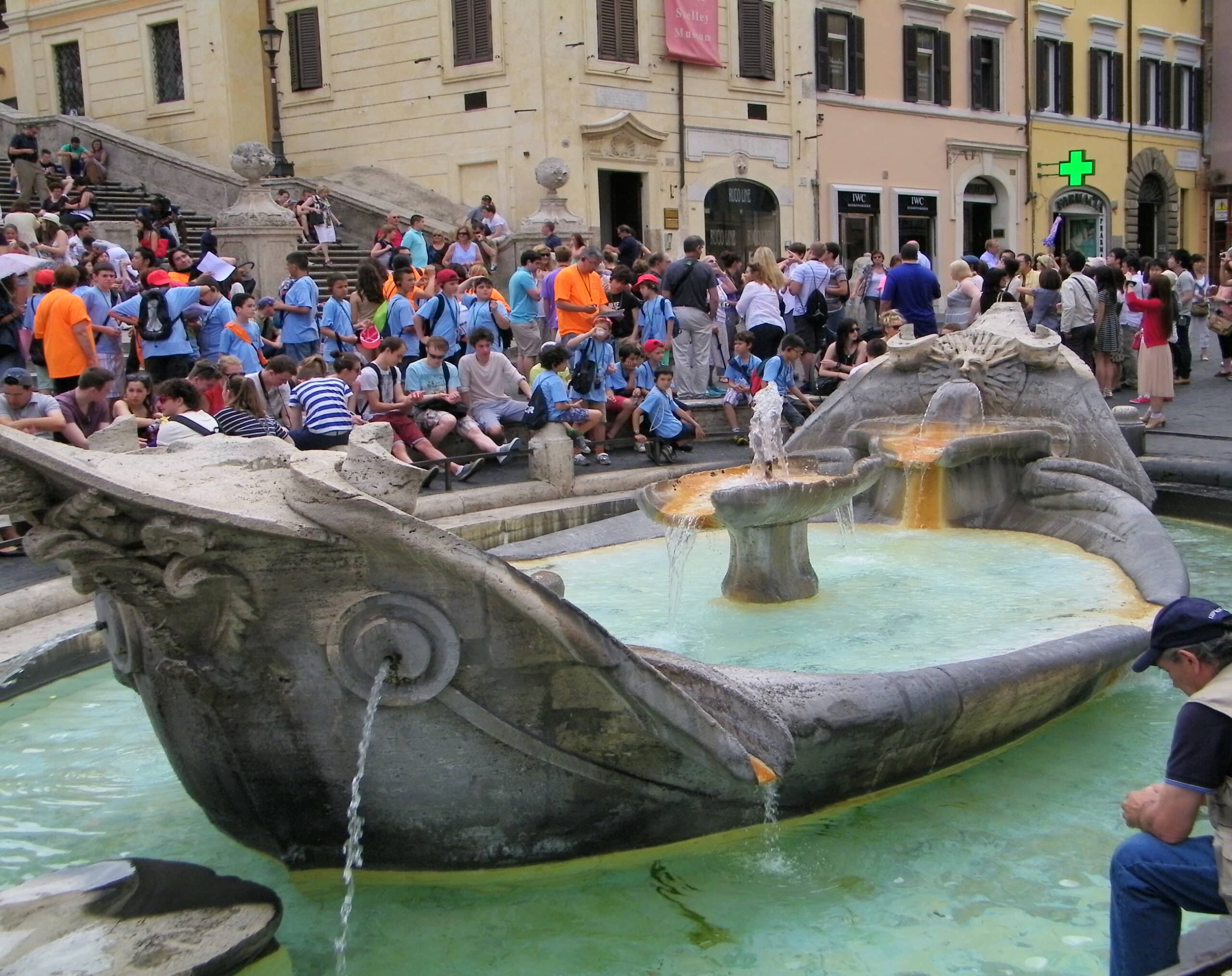 At the bottom of the Spanish Steps is the Fontana della Barcaccia (Fountain of the Ugly Boat), a fresh-water fountain that looks like a half-sunken ship with water overflowing its bows. This shape was chosen because prior to the river walls being built, flooding from the Tiber River often left boats in the square.