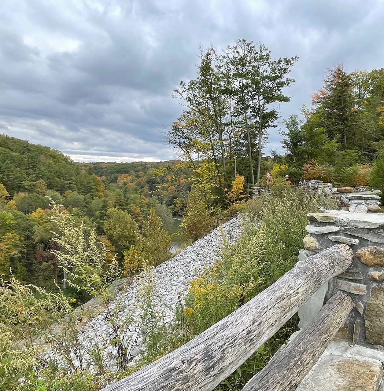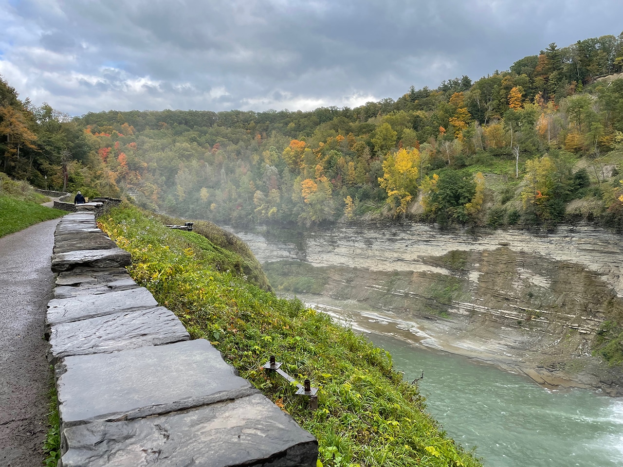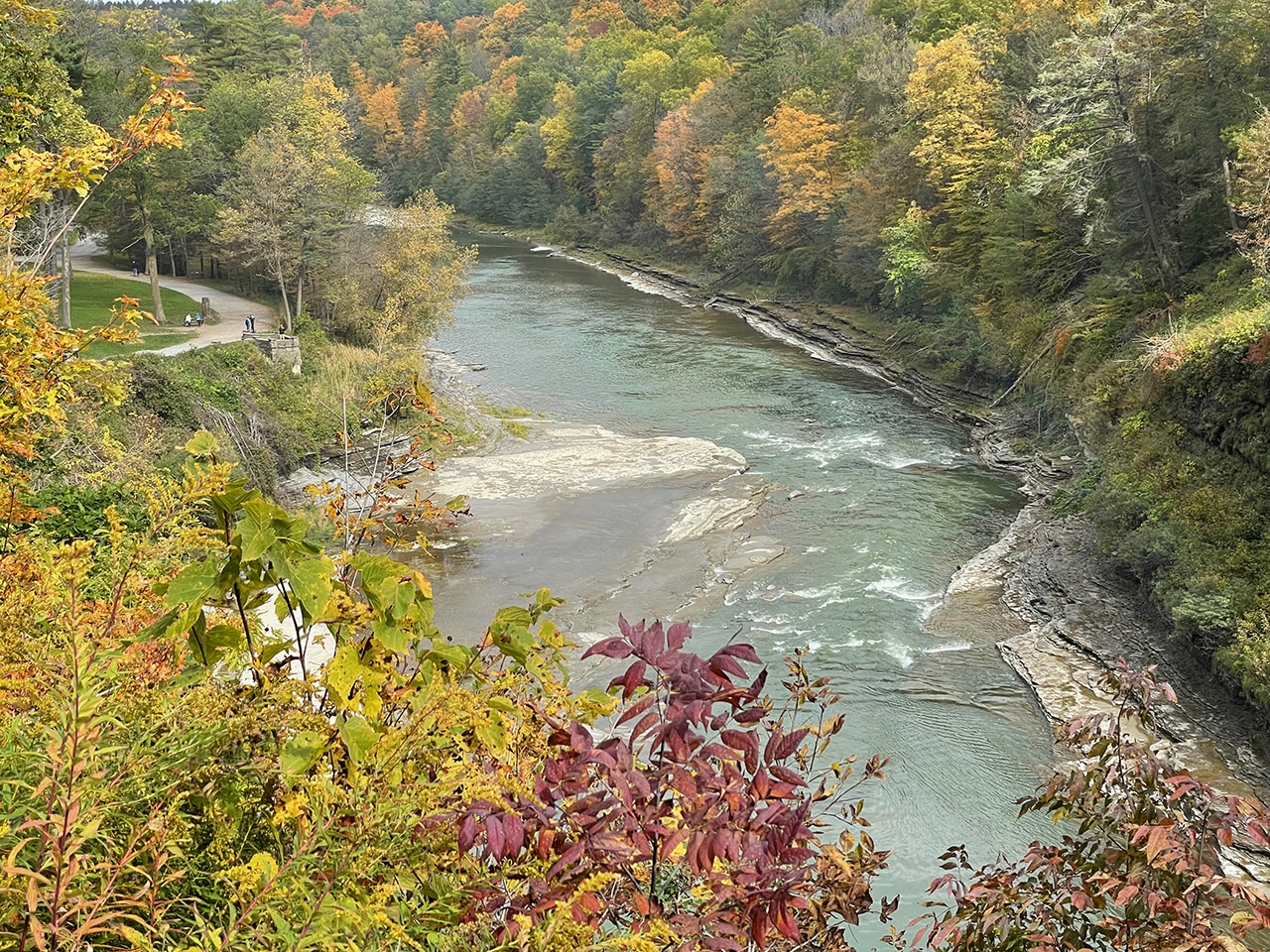 Still above the falls we had a bird’s eye view of the river, with spectacular colors, and a glimpse of the walkway down below. Too bad we didn’t more throughly examine the park map before we left, because as we started to descend Jim decided to head back. I could have just continued my downward climb and met him at that walkway, rather than climb all the way back up to meet him and take the car down river a little further. Oh well, it’s good for the legs, right?