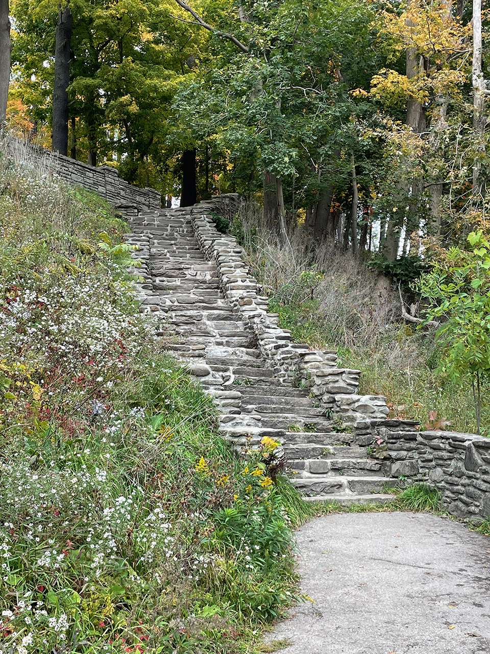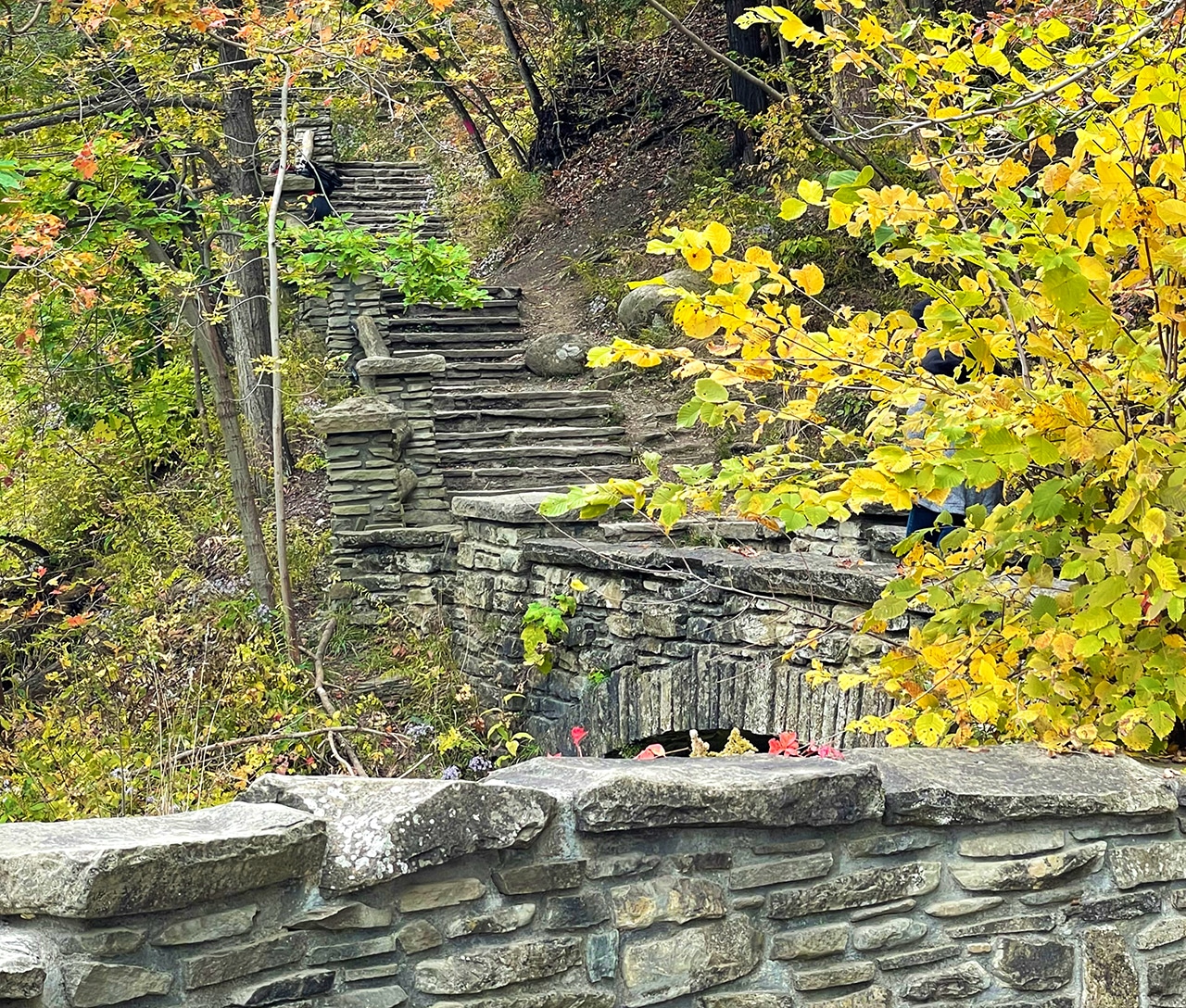 High up we could hear the roar of the falls, and we caught glimpses of the beauty we’d see as we got closer to the action. We admired the lovely (sturdy) work of the CCC (Civilian Conservation Corps), who in the 1930s worked hard to make our national parks safe and beautiful with massive railings and rock stairways. Their work is evident – and greatly appreciated – all over this park.