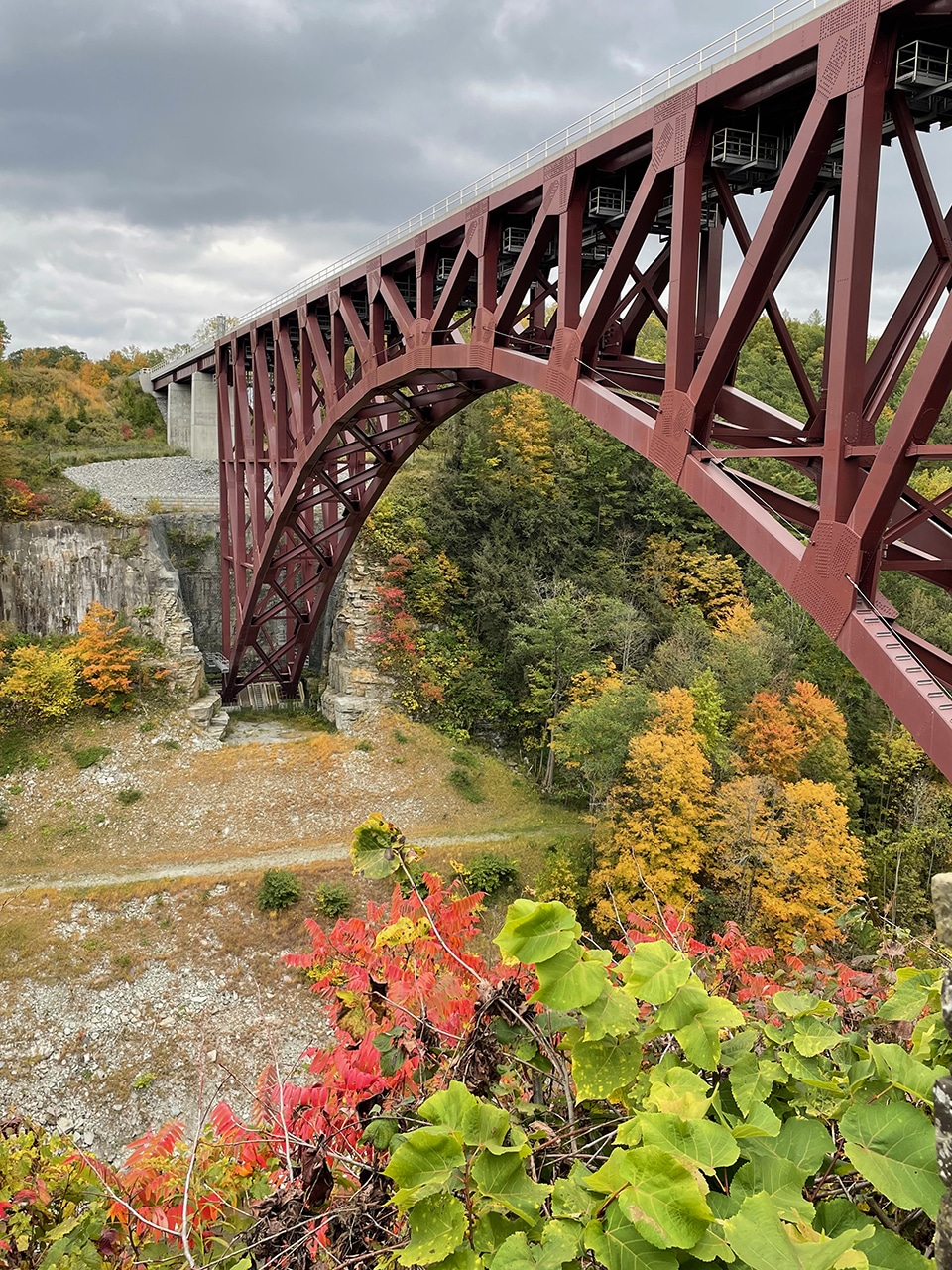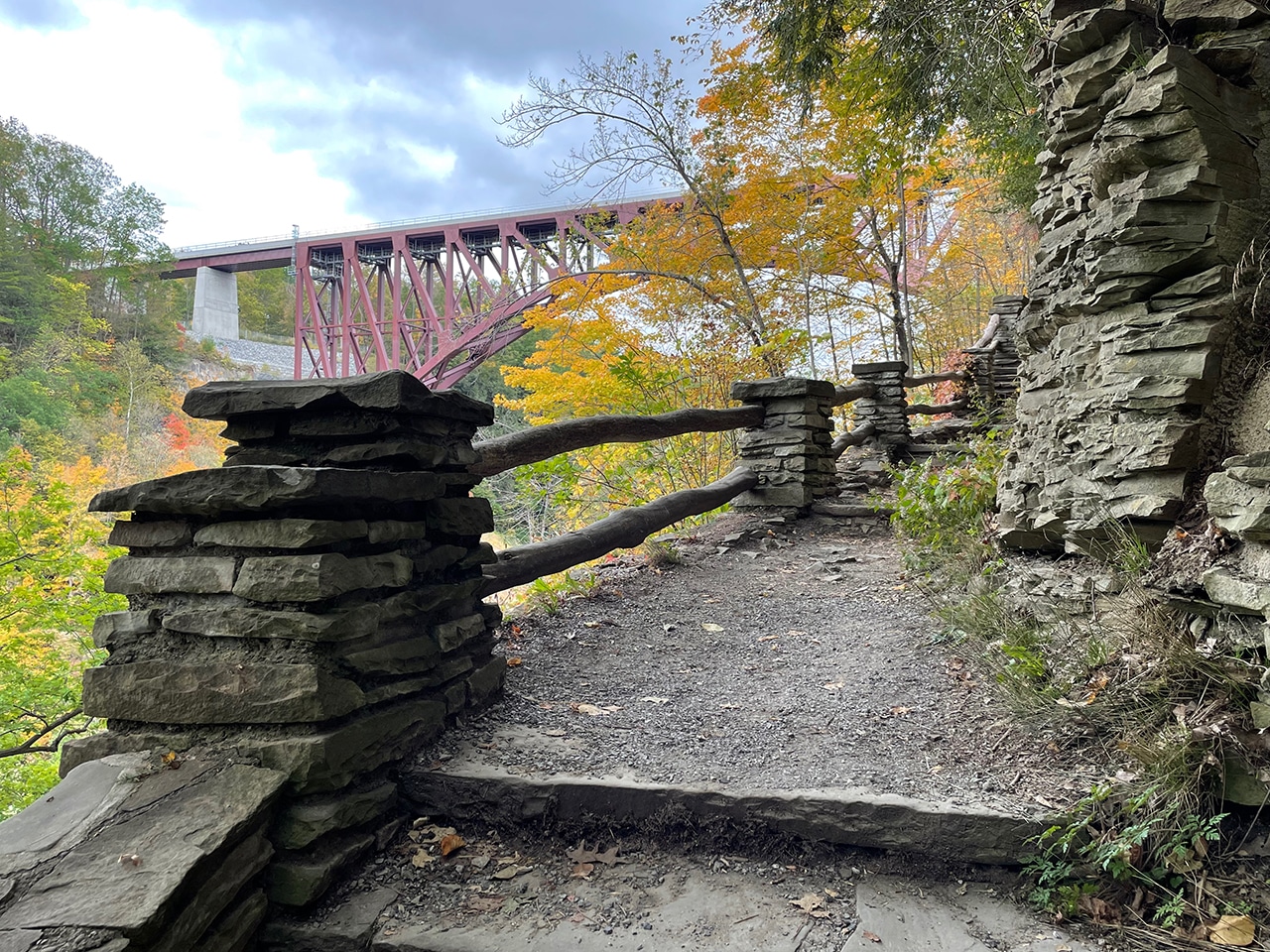 < “The steep-sided gorges and rivers of the Genesee Valley presented many obstacles for transporting agricultural goods and lumber to larger markets. Encompassing over 120 miles and serviced by 104 locks, the Genesee Valley Canal served as a major transportation hub in the region before the bridge was built. The canal operated between 1840 and 1878 but did not open fully until 1862. The Buffalo and New York City Railroad chose this spot to bridge the gorge, finishing the timber trestle “High Bridge of Portage” in 1852, the longest and highest span of its kind during this period.