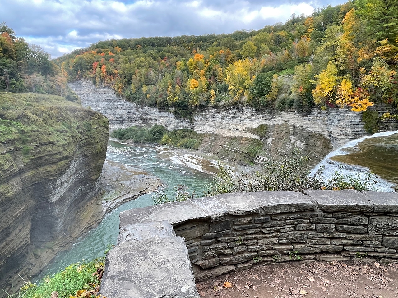A very easy walk got us to the overlook and I ventured down another level for a slightly better angle. Although the gorge and rim trails would have offered even better views from above and below the falls, we didn’t have that kind of time. And to be honest, seeing the falls from this perspective was amazing. The leaves had reached a beautiful goldish glow and the contrast with the rock was absolutely breathtaking!